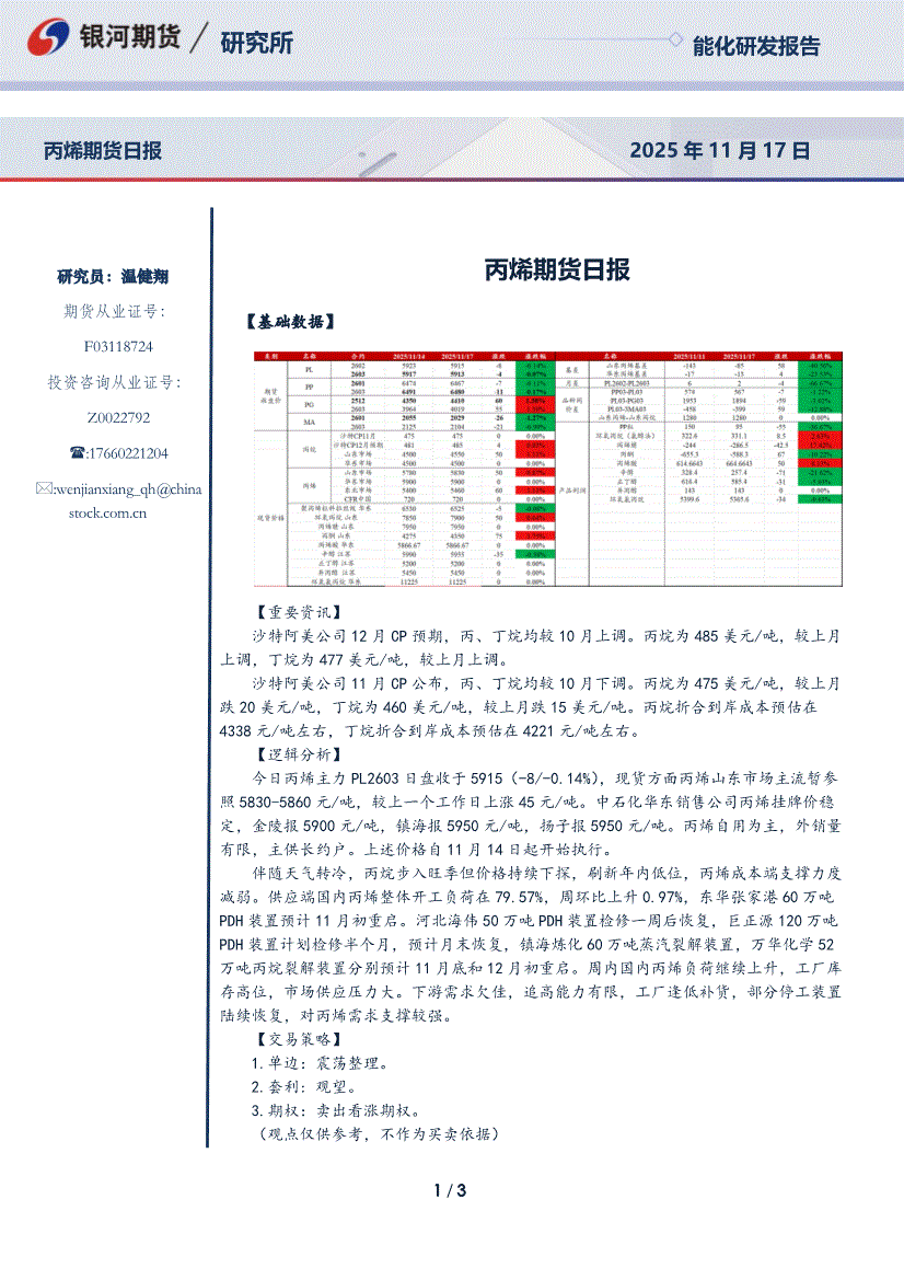 银河期货-丙烯月度报告:高库存压制,供应压力仍然较大-251201