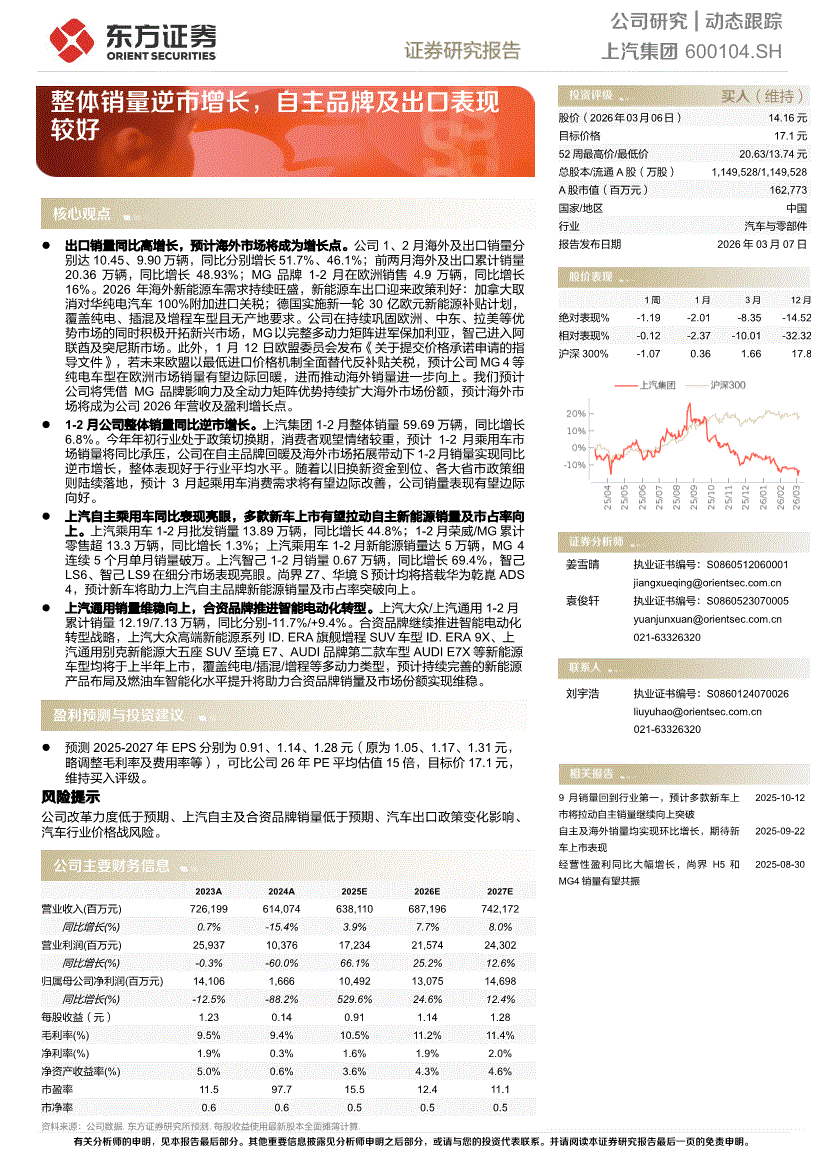 上汽集团:东方证券-上汽集团-600104-整体销量逆市增长,自主品牌及出口表现较好-260307
