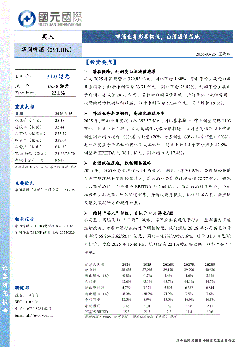 华润啤酒:国元国际-华润啤酒-0291.HK-啤酒业务彰显韧性,白酒减值落地-260326