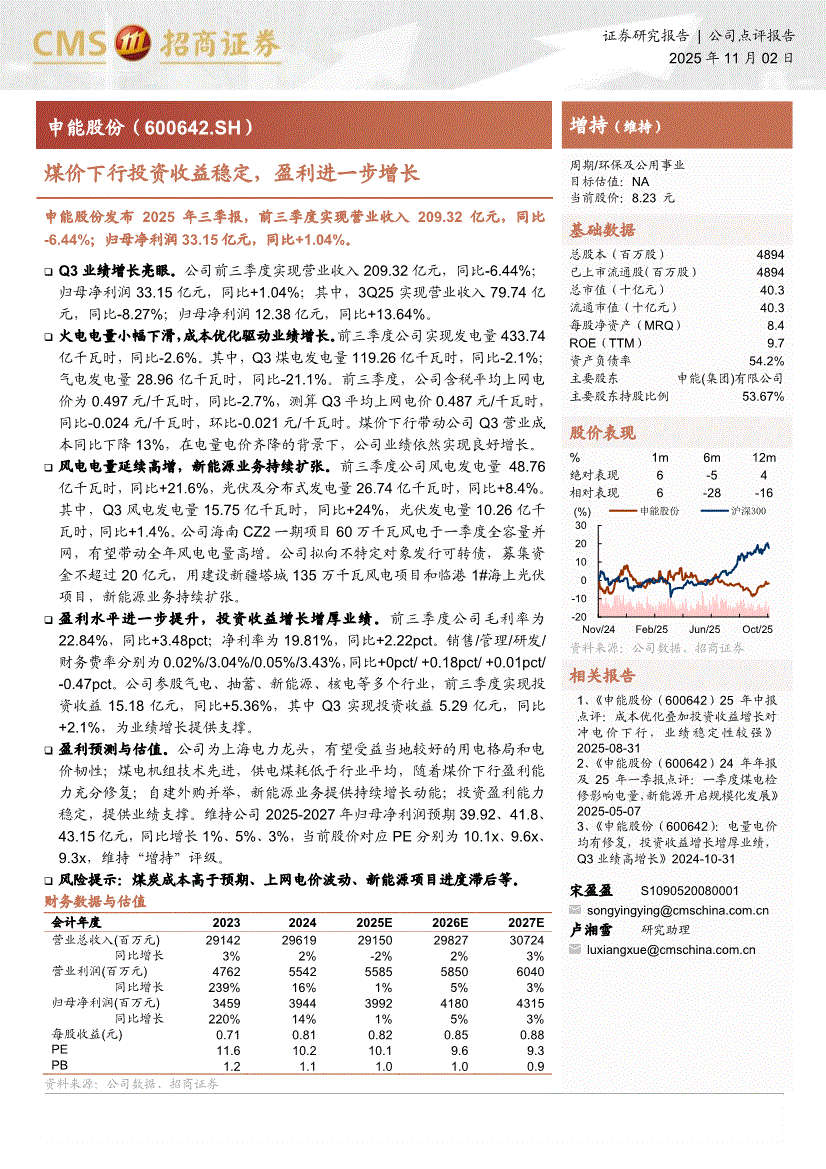 申能股份:招商证券-申能股份-600642-煤价下行投资收益稳定,盈利进一步增长-251102
