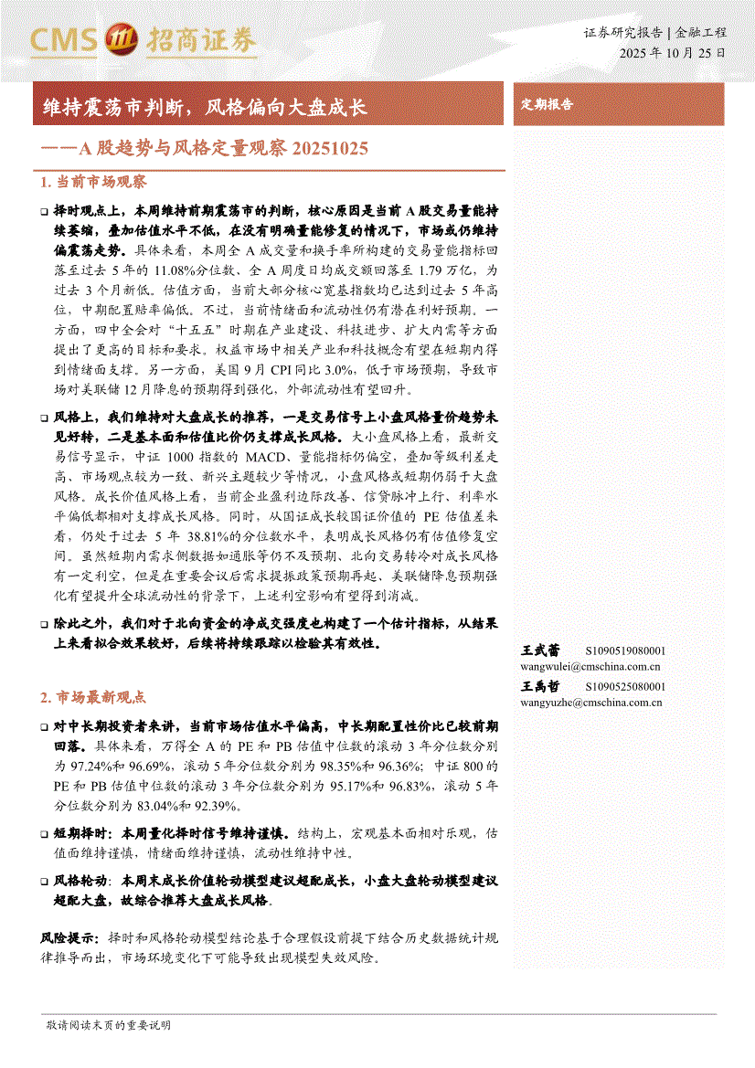 招商证券-A股趋势与风格定量观察:维持震荡市判断,风格偏向大盘成长-251025