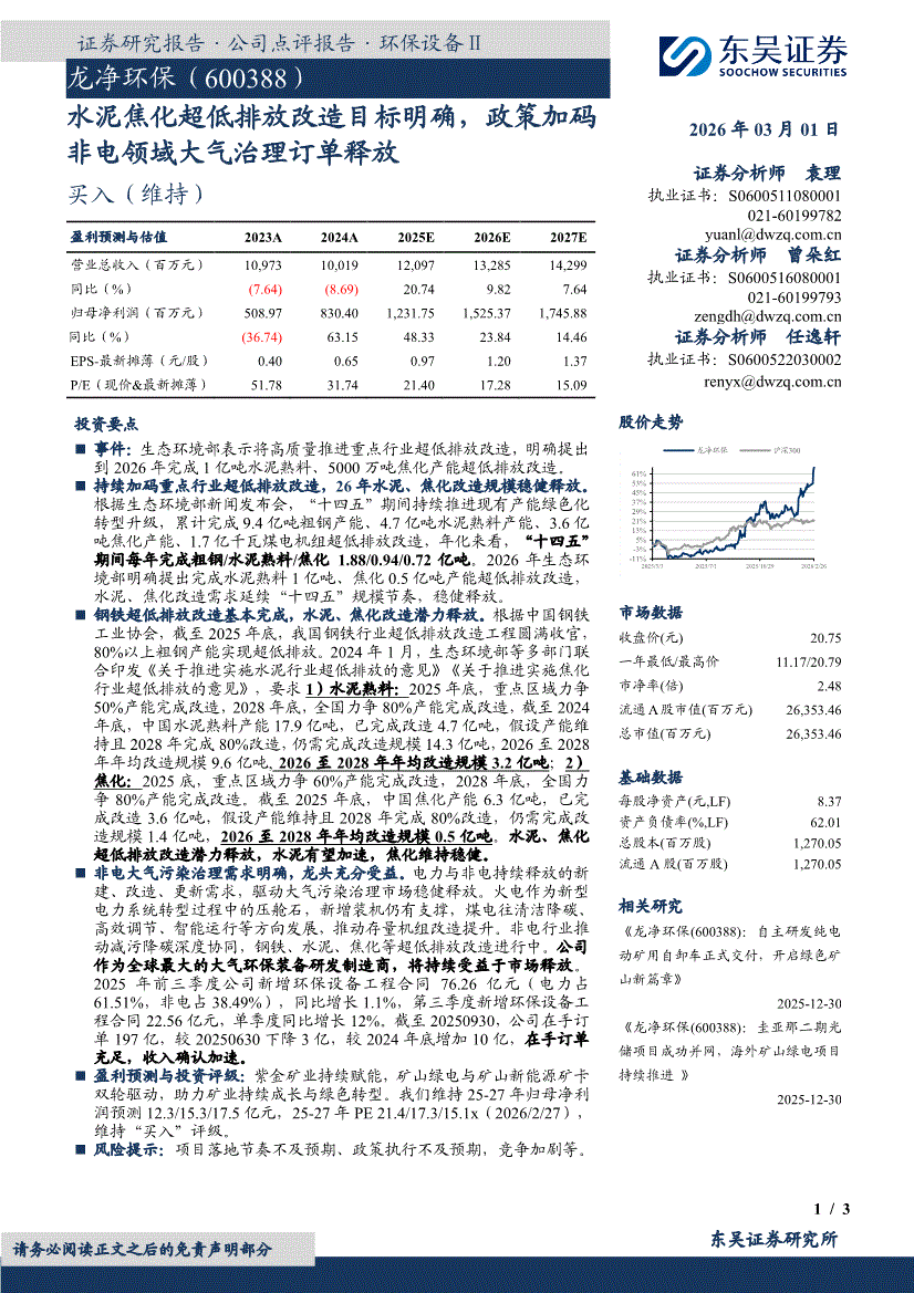 龙净环保:东吴证券-龙净环保-600388-水泥焦化超低排放改造目标明确,政策加码非电领域大气治理订单释放-260301