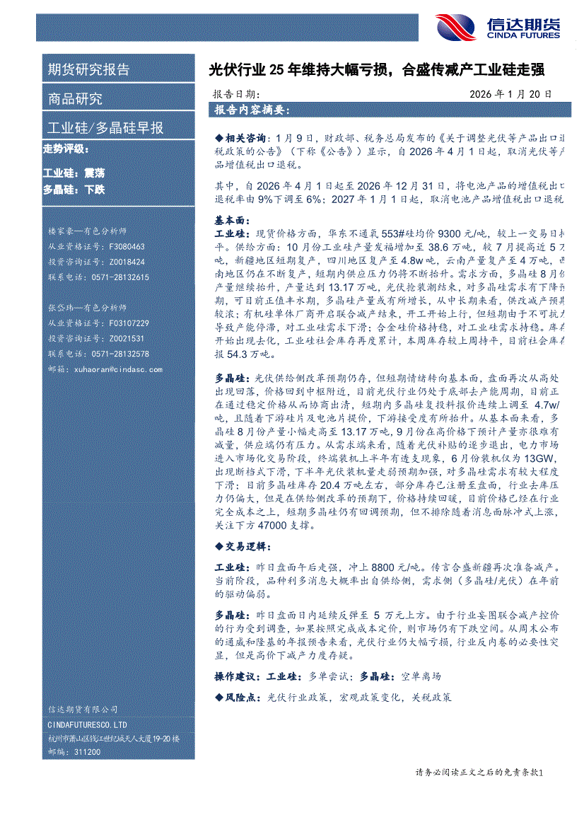 信达期货-工业硅/多晶硅早报:光伏行业25年维持大幅亏损,合盛传减产工业硅走强-260120