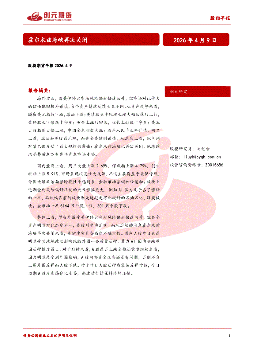 创元期货-股指早报:霍尔木兹海峡再次关闭-260409