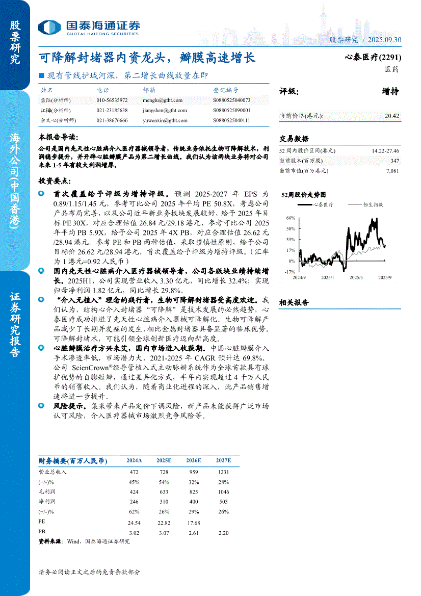 心泰医疗:国泰海通证券-心泰医疗-2291.HK-现有管线护城河深,第二增长曲线放量在即,可降解封堵器内资龙头,瓣膜高速增长-250930