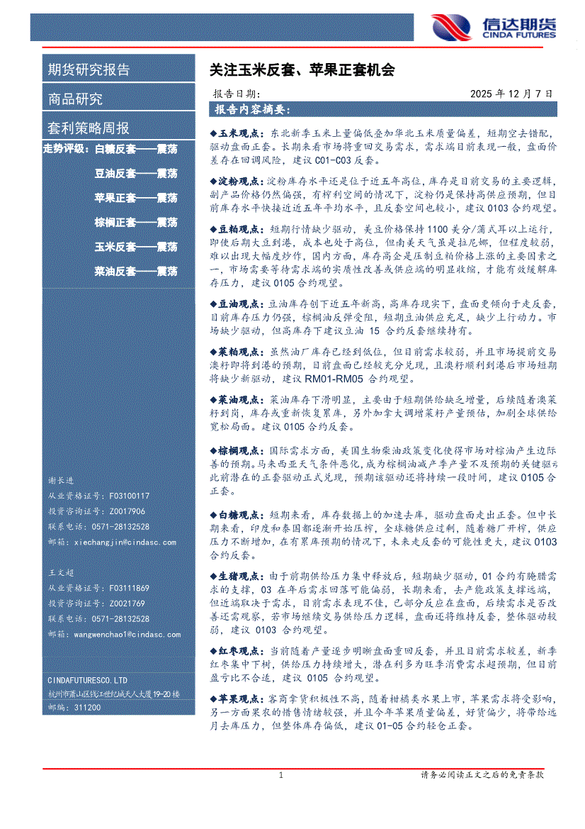 信达期货-套利策略周报:关注玉米反套、苹果正套机会-251207
