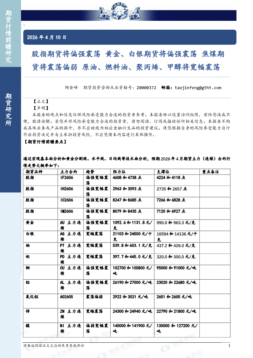 国泰君安期货-股指期货将偏强震荡,黄金、白银期货将偏强震荡,焦煤期货将震荡偏弱。原油、燃料油、聚丙烯、甲醇将宽幅震荡-260410