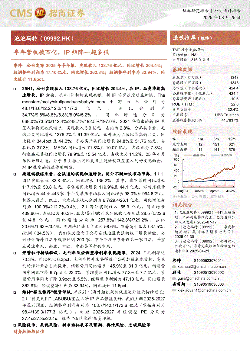 泡泡玛特:招商证券-泡泡玛特-9992.HK-半年营收破百亿,IP矩阵一超多强-250825