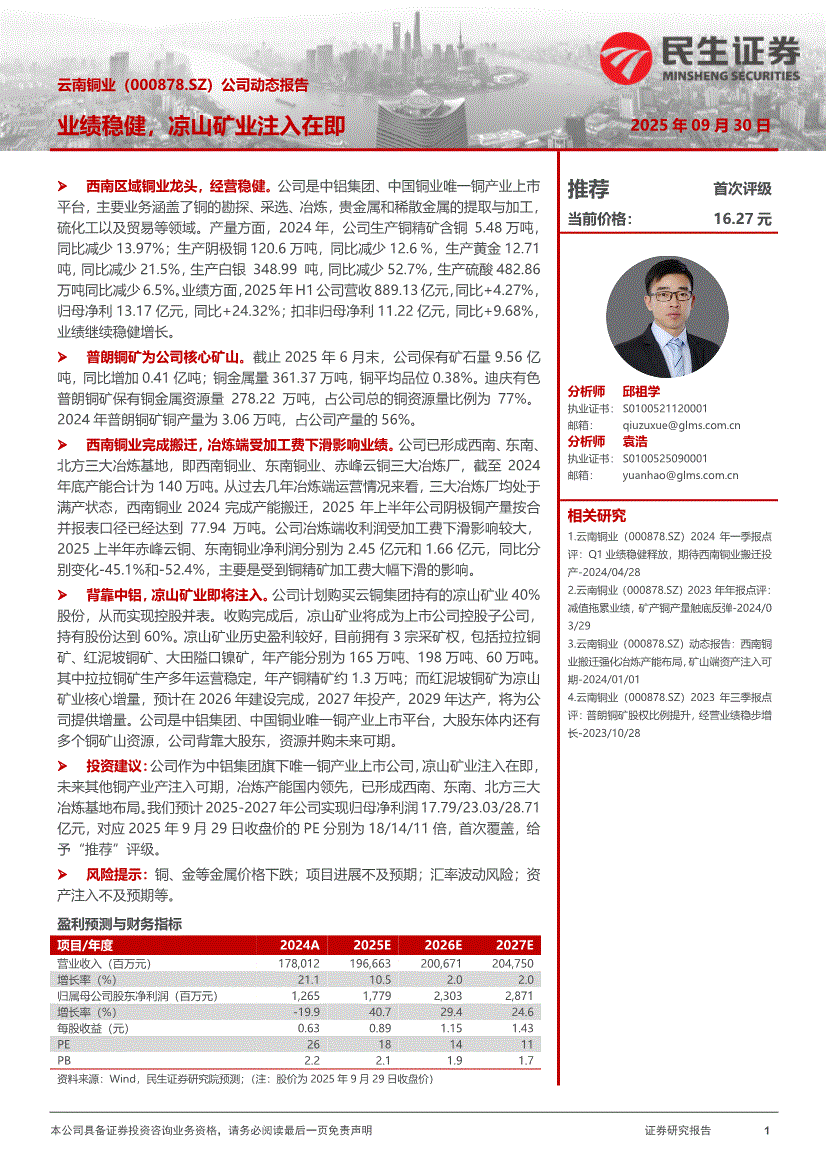 云南铜业:民生证券-云南铜业-000878-公司动态报告:业绩稳健,凉山矿业注入在即-250930