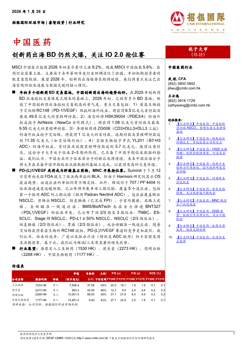 医药行业:招银国际-中国医药行业:创新药出海BD仍然火爆,关注IO 2.0抢位赛-260126