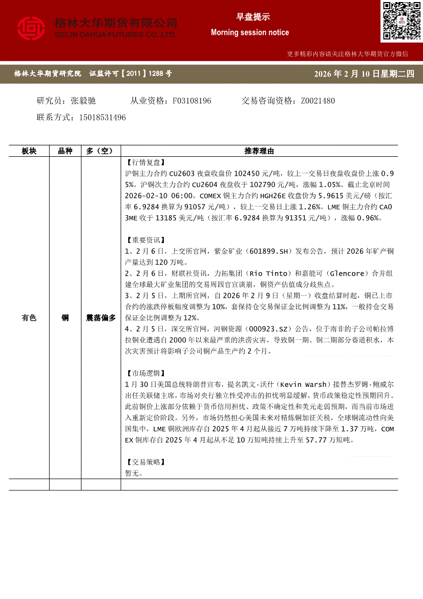 格林大华期货-早盘提示:铜-260209