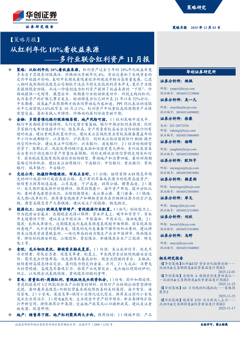 华创证券-【策略月报】多行业联合红利资产11月报:从红利年化10%看收益来源-251203