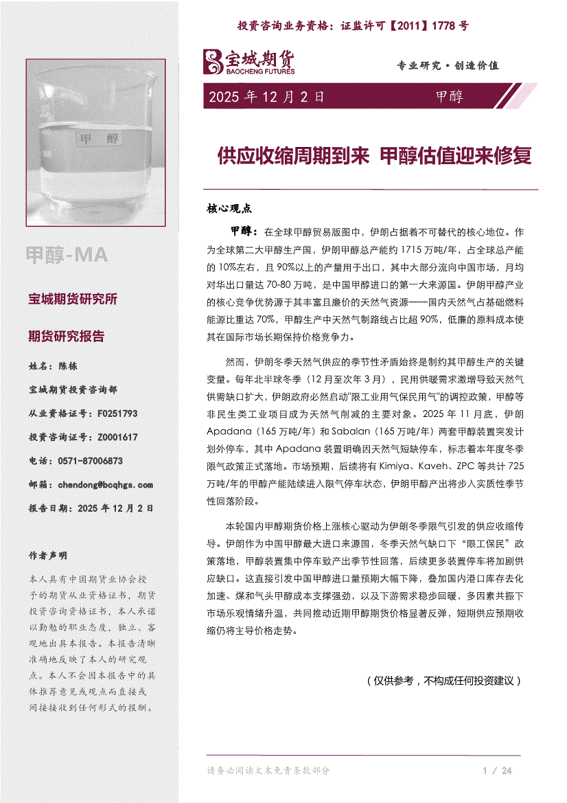 宝城期货-甲醇专题报告:供应收缩周期到来,甲醇估值迎来修复-251202