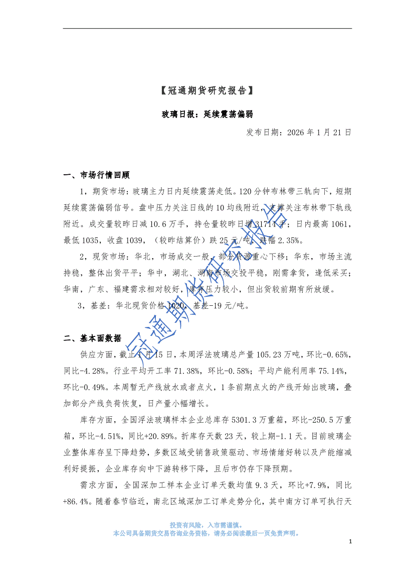 冠通期货-玻璃日报:延续震荡偏弱-260121