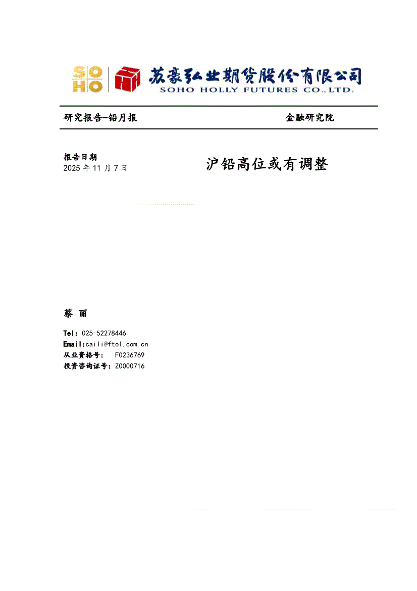 弘业期货-铅月报:沪铅高位或有调整-251107