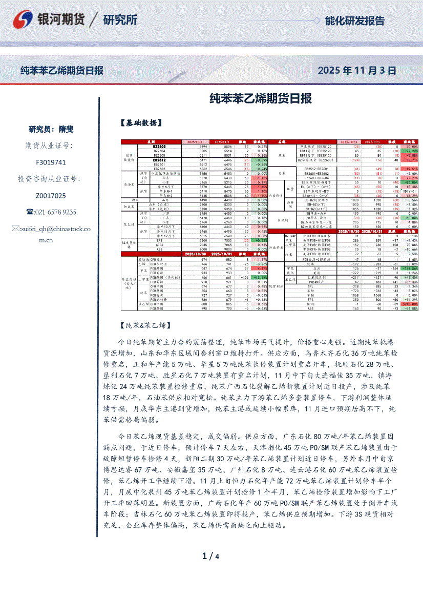 银河期货-纯苯苯乙烯期货日报-251103