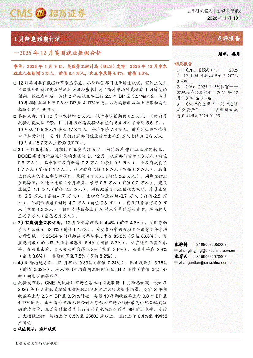 招商证券-2025年12月美国就业数据分析:1月降息预期打消-260110
