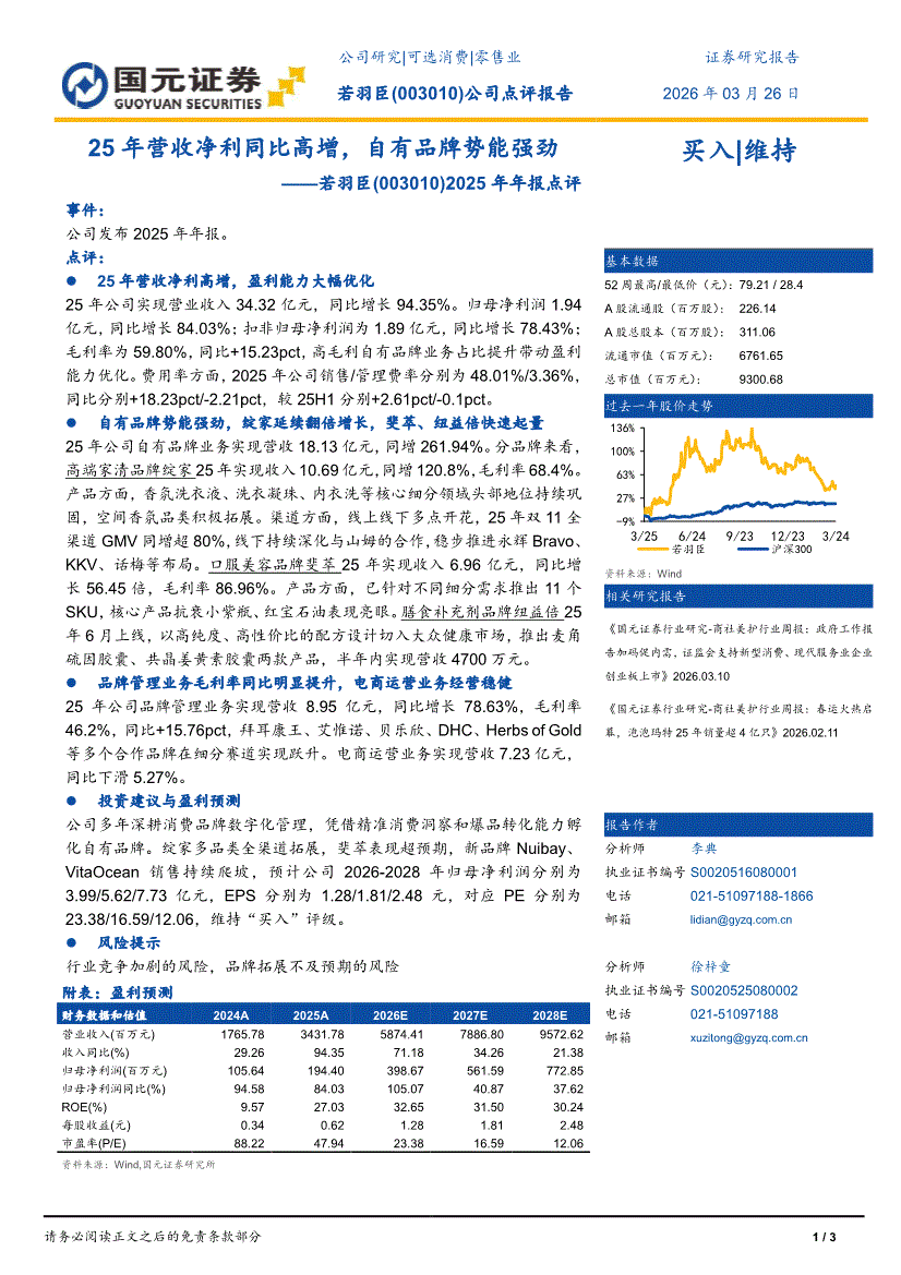 若羽臣:国元证券-若羽臣-003010-2025年年报点评:25年营收净利同比高增,自有品牌势能强劲-260326