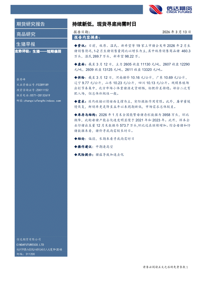 信达期货-生猪早报:持续新低,现货寻底尚需时日-260313