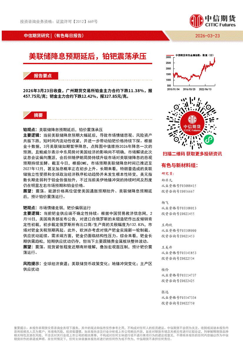 中信期货-有色每日报告:美联储降息预期延后,铂钯震荡承压-260323