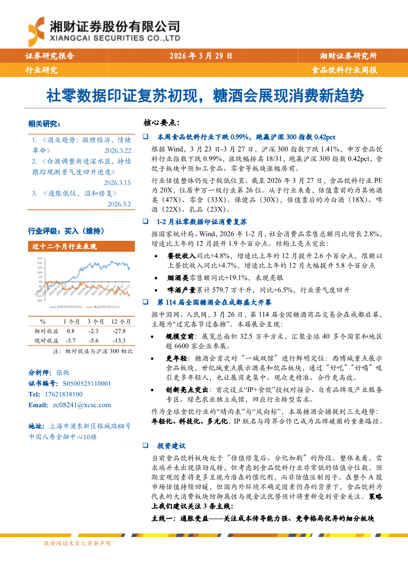 食品饮料行业:湘财证券-食品饮料行业周报:社零数据印证复苏初现,糖酒会展现消费新趋势-260329
