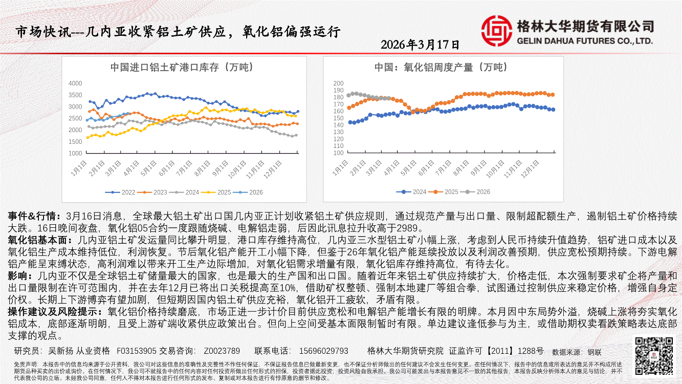 格林大华期货-市场快讯~几内亚收紧铝土矿供应,氧化铝偏强运行-260317