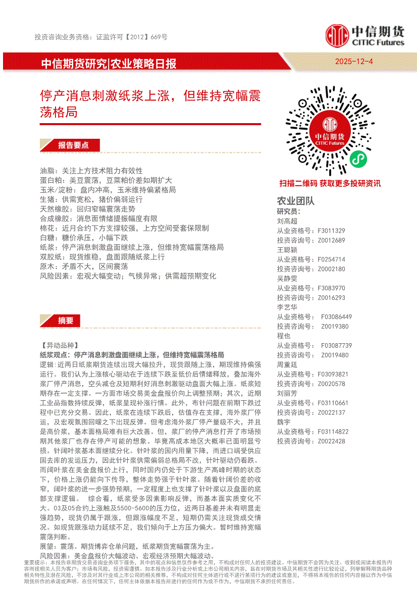 中信期货-农业策略日报:停产消息刺激纸浆上涨,但维持宽幅震荡格局-251204