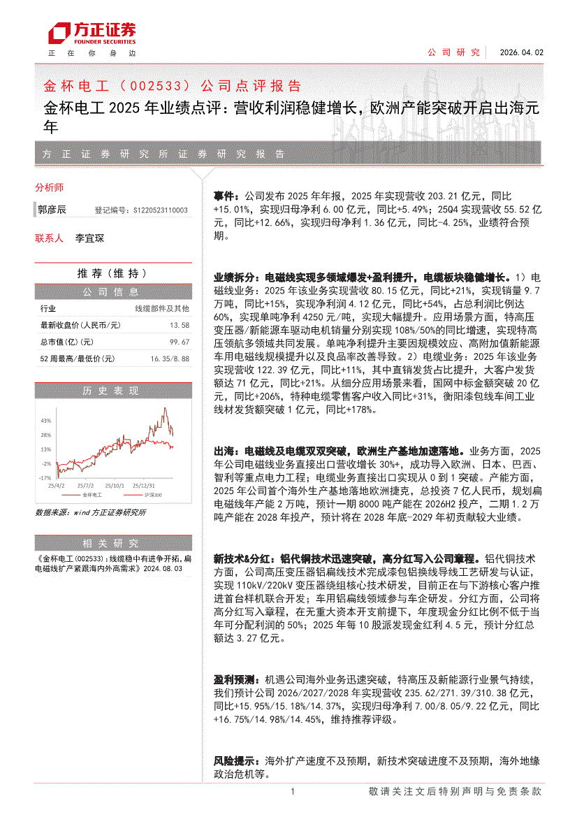 金杯电工:方正证券-金杯电工-002533-公司点评报告:2025年业绩点评,营收利润稳健增长,欧洲产能突破开启出海元年-260402