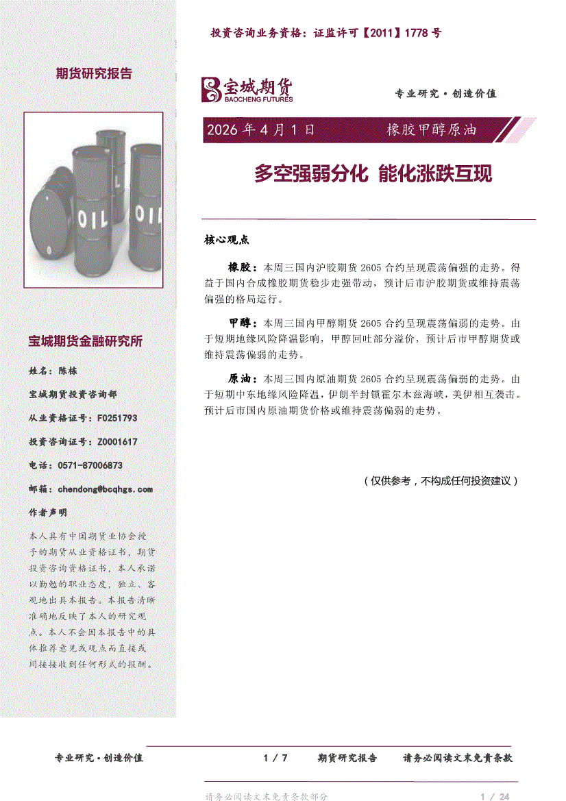 宝城期货-橡胶甲醇原油:多空强弱分化能化涨跌互现-260401