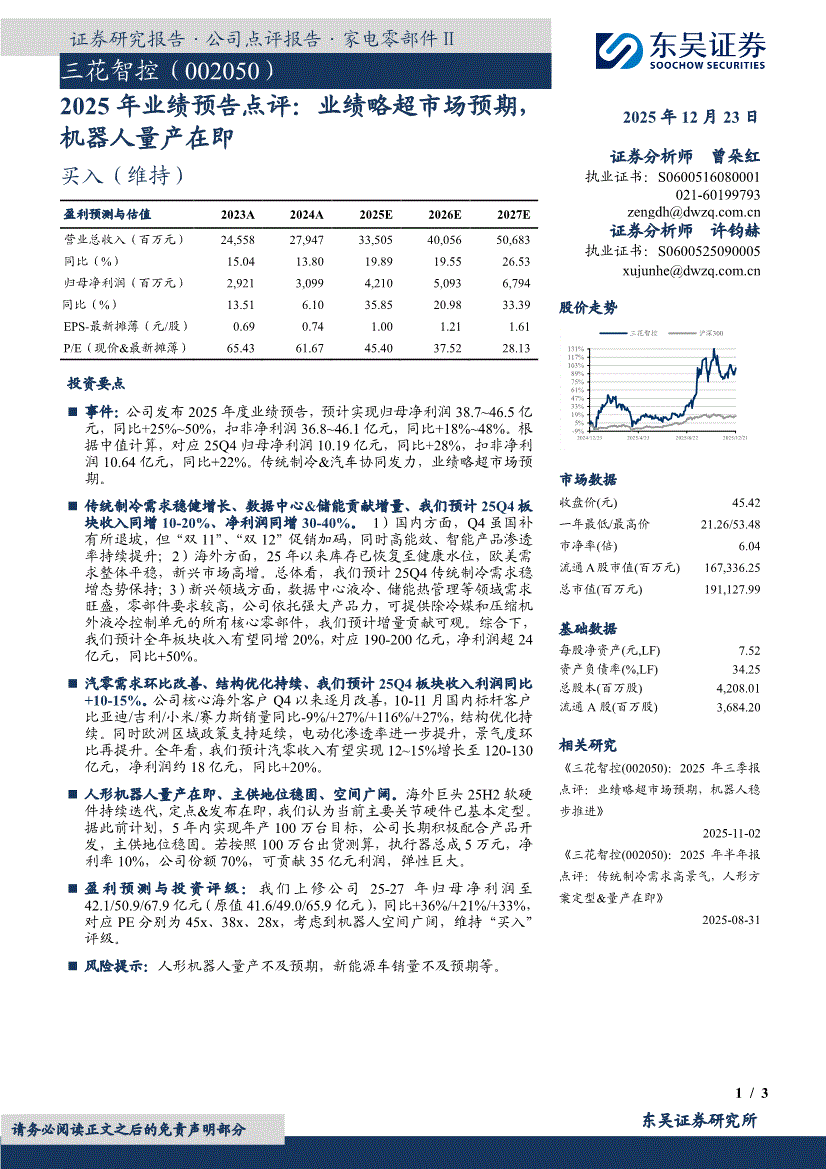 三花智控:东吴证券-三花智控-002050-2025年业绩预告点评:业绩略超市场预期,机器人量产在即-251223