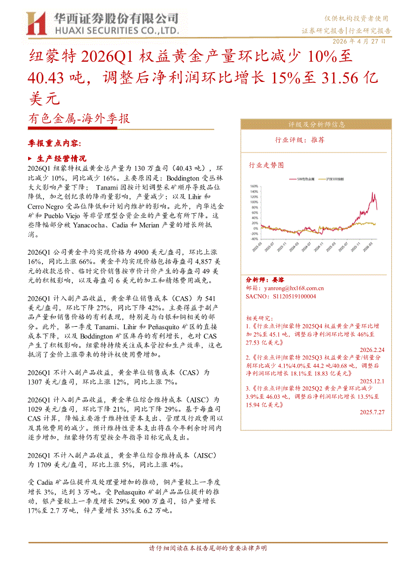 有色金属行业:华西证券-有色金属行业~海外季报:纽蒙特2026Q1权益黄金产量环比减少10%至40.43吨,调整后净利润环比增长15%至31.56亿美元-260427