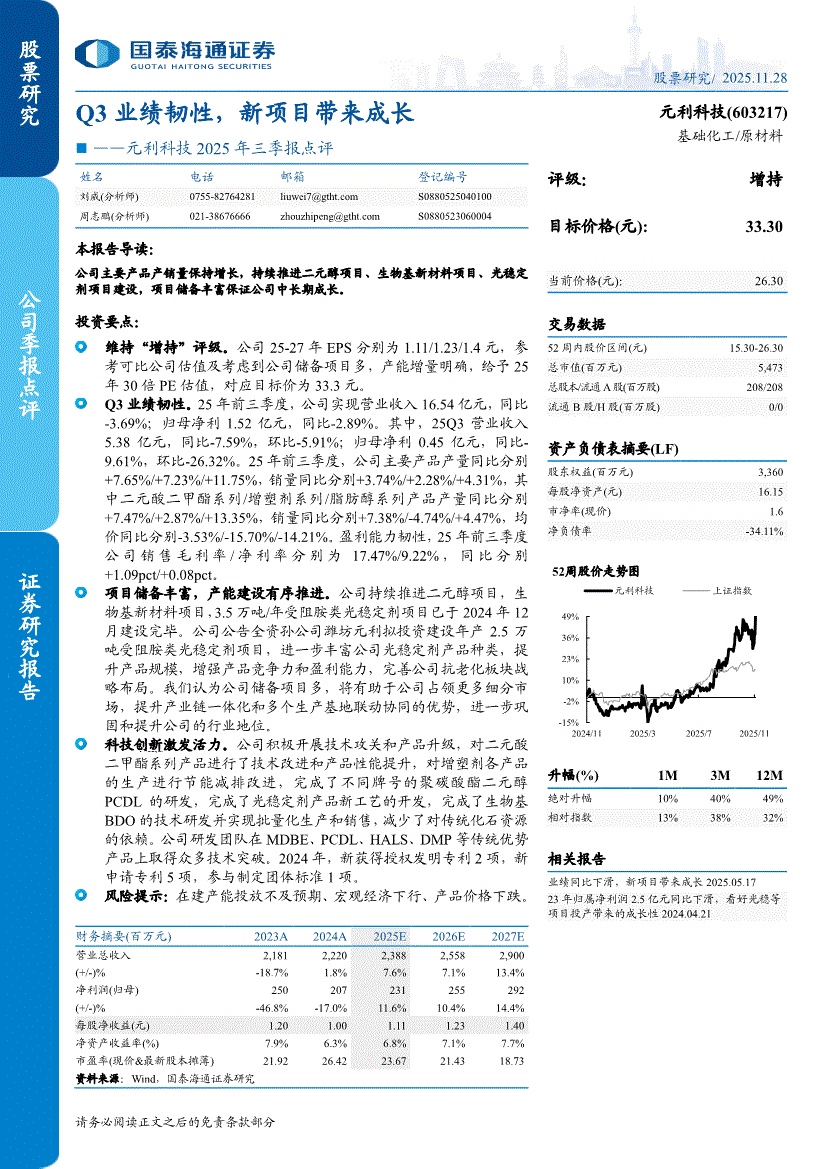 元利科技:国泰海通证券-元利科技-603217-2025年三季报点评:Q3业绩韧性,新项目带来成长-251128