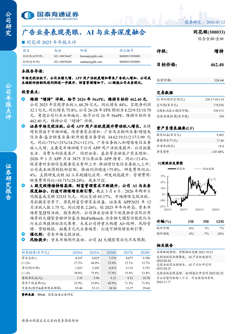 同花顺:国泰海通证券-同花顺-300033-2025年年报点评:广告业务表现亮眼,AI与业务深度融合-260312