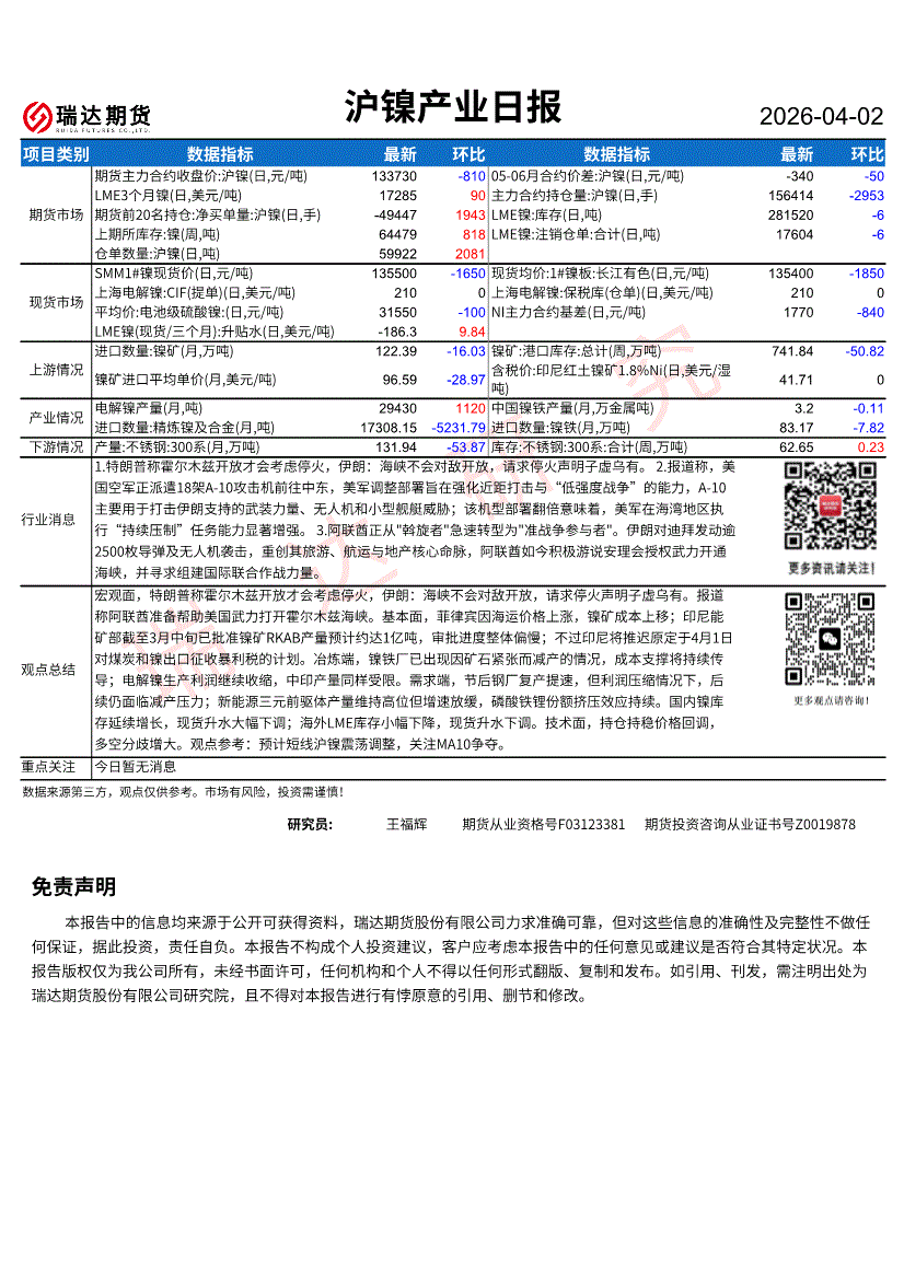 瑞达期货-沪镍产业日报-260402