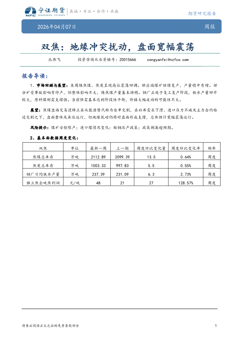 宁证期货-双焦:地缘冲突扰动,盘面宽幅震荡-260407