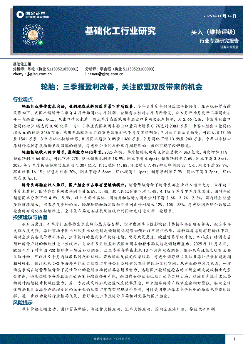 基础化工行业:国金证券-基础化工行业:轮胎,三季报盈利改善,关注欧盟双反带来的机会-251114