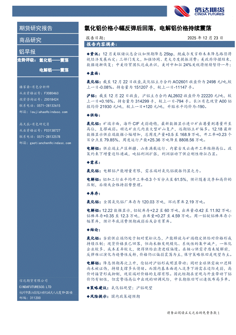 信达期货-铝早报:氧化铝价格小幅反弹后回落,电解铝价格持续震荡-251223