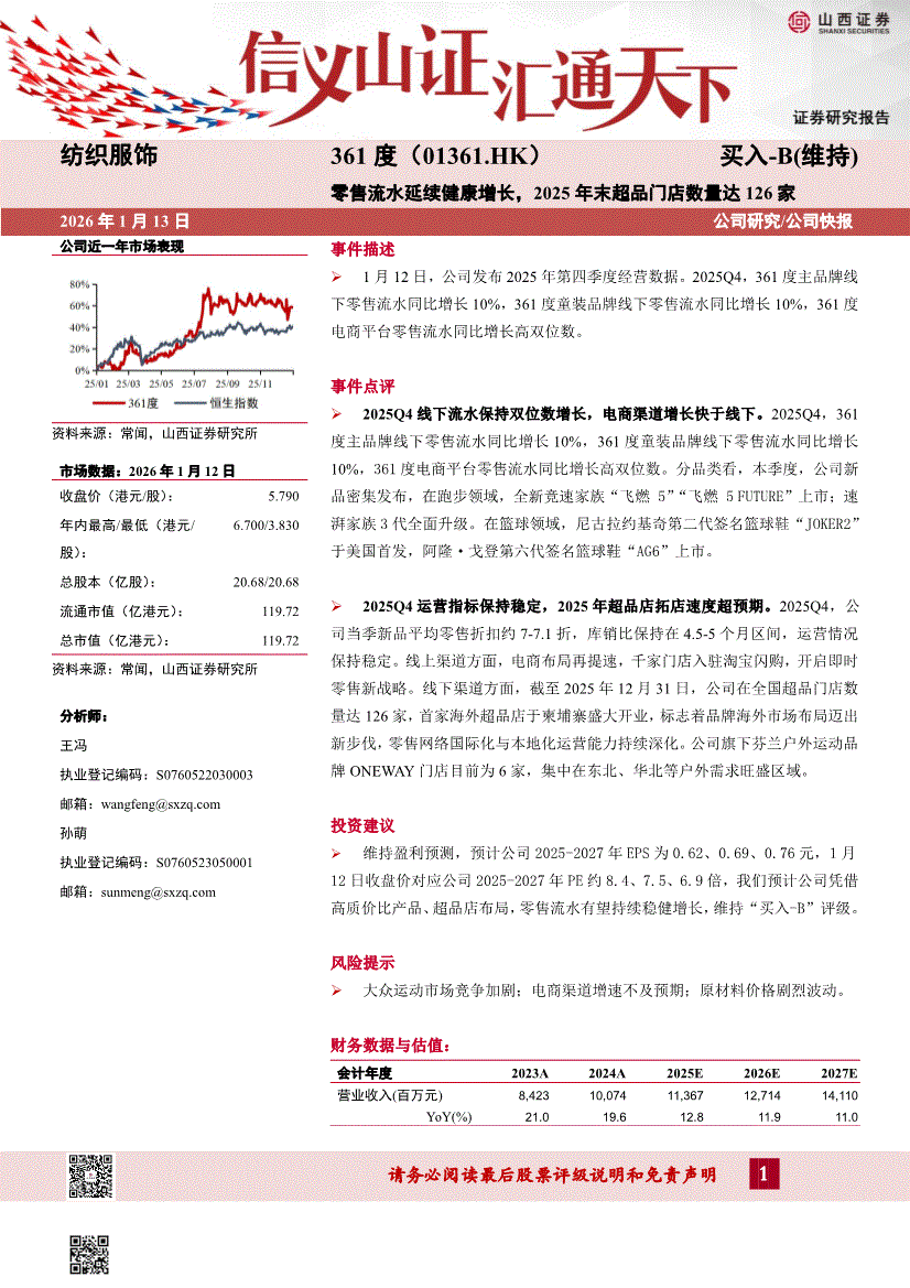 361度:山西证券-361度-1361.HK-零售流水延续健康增长,2025年末超品门店数量达126家-260113