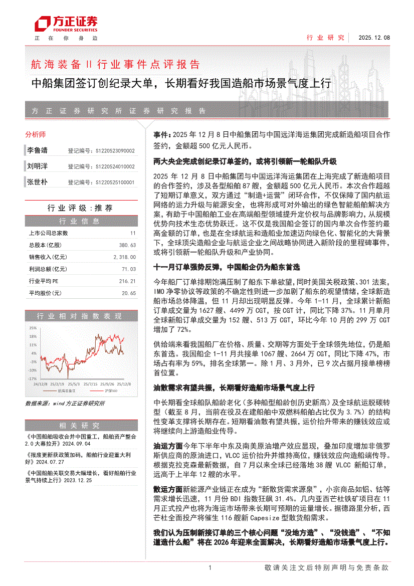 航海装备行业:方正证券-航海装备Ⅱ行业事件点评报告:中船集团签订创纪录大单,长期看好我国造船市场景气度上行-251208