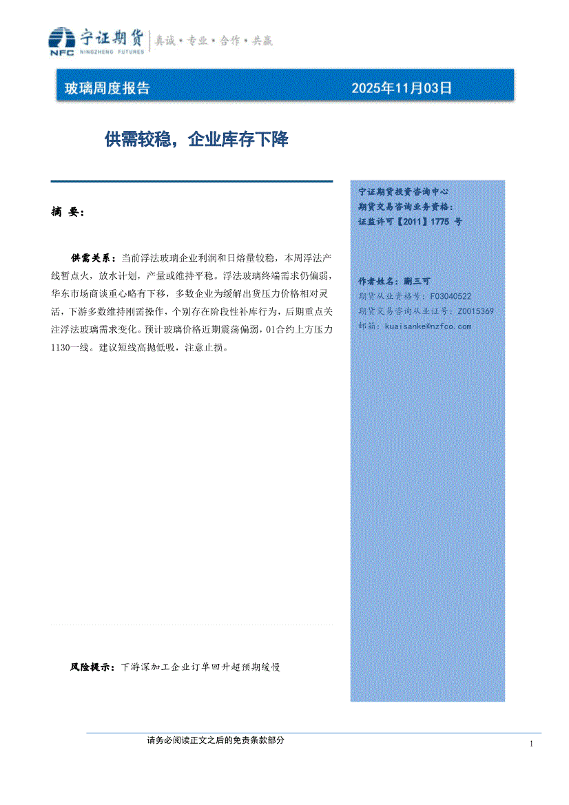 宁证期货-玻璃周度报告:供需较稳,企业库存下降-251103
