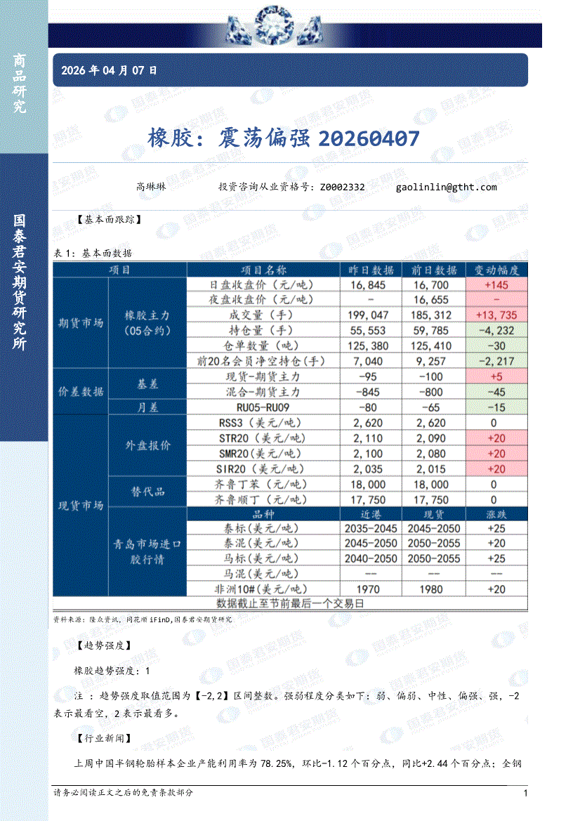 国泰君安期货-橡胶:震荡偏强-260407