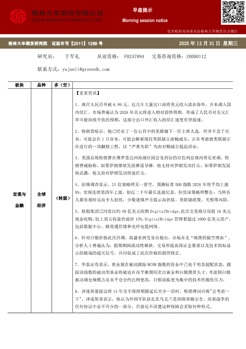 格林大华期货-早盘提示:全球经济-251231