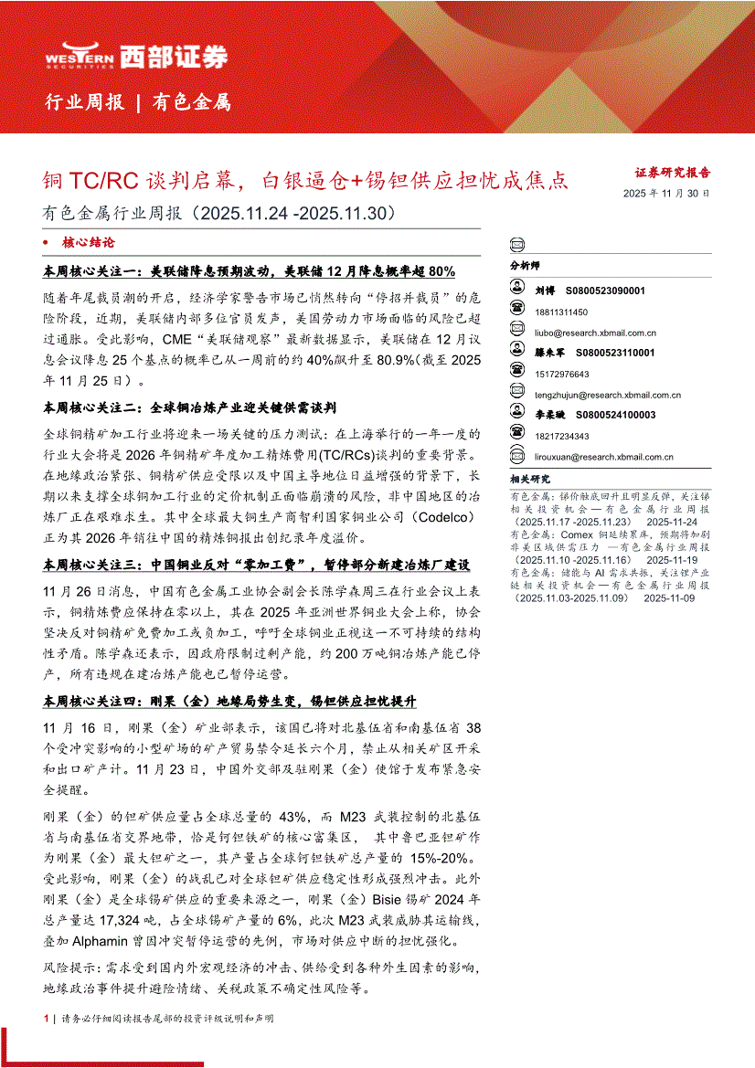 有色金属行业:西部证券-有色金属行业周报:铜TC/RC谈判启幕,白银逼仓+锡钽供应担忧成焦点-251130