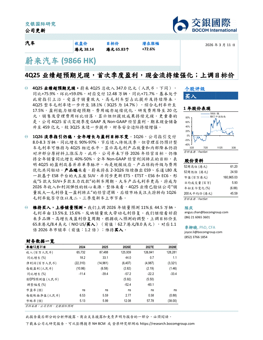 蔚来汽车:交银国际-蔚来汽车-9866.HK-4Q25业绩超预期兑现,首次季度盈利,现金流持续强化;上调目标价-260311