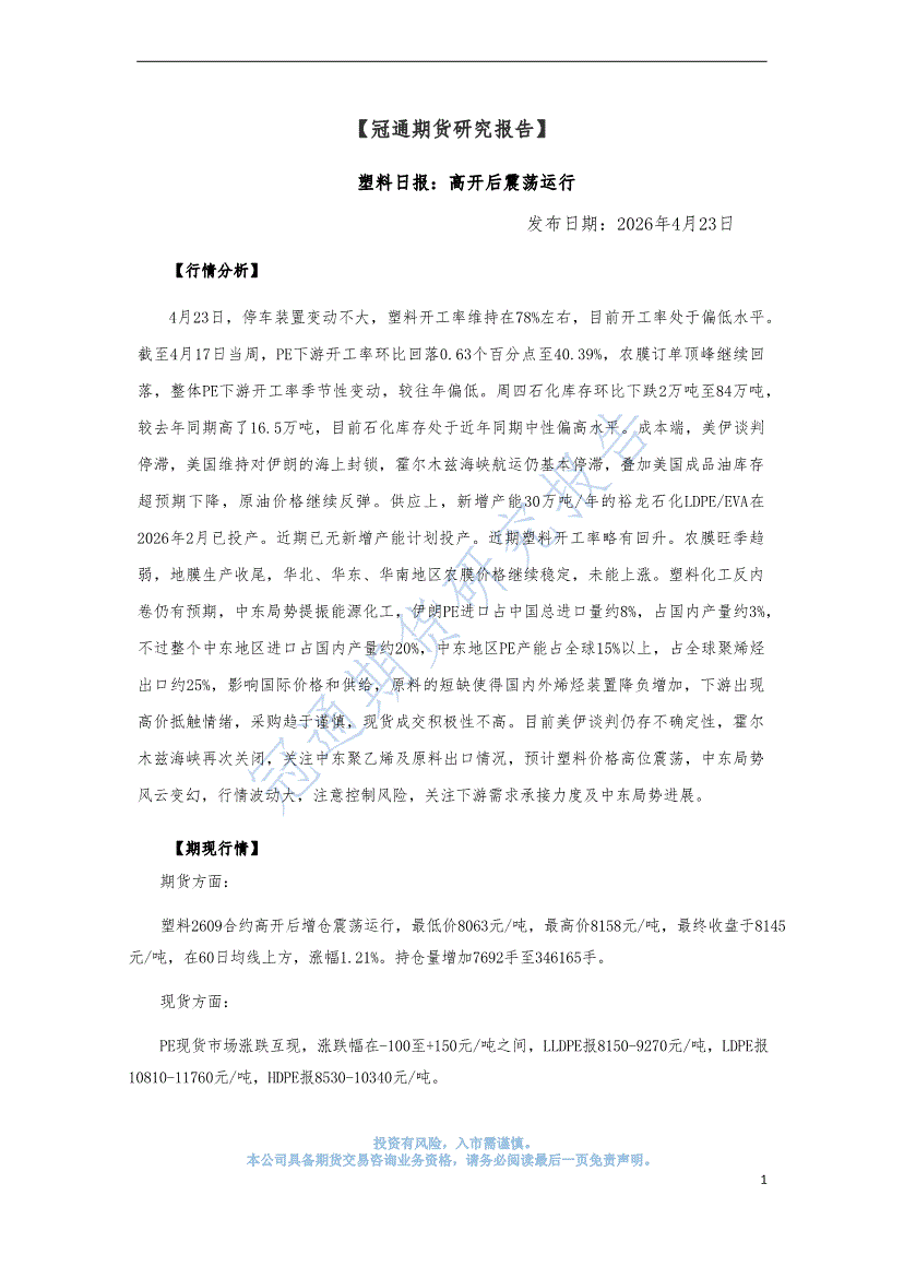 冠通期货-PP日报:PP低开后震荡上行-260424