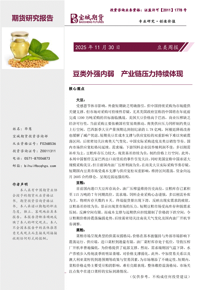 宝城期货-豆类周报:豆类外强内弱,产业链压力持续体现-251130
