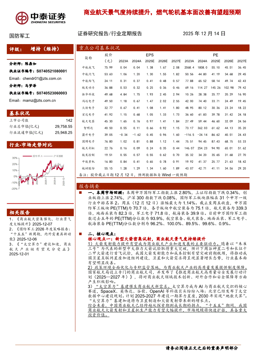 国防军工行业:中泰证券-国防军工行业:商业航天景气度持续提升,燃气轮机基本面改善有望超预期-251214
