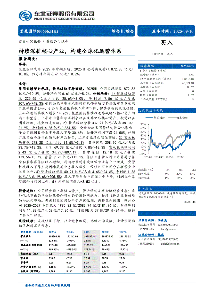 复星国际:东北证券-复星国际-0656.HK-持续深耕核心产业,构建全球化运营体系-250910