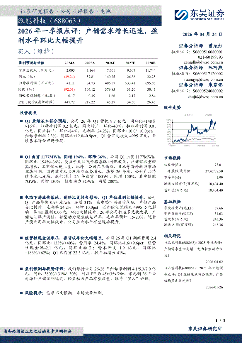 派能科技:东吴证券-派能科技-688063-2026年一季报点评:户储需求增长迅速,盈利水平环比大幅提升-260424