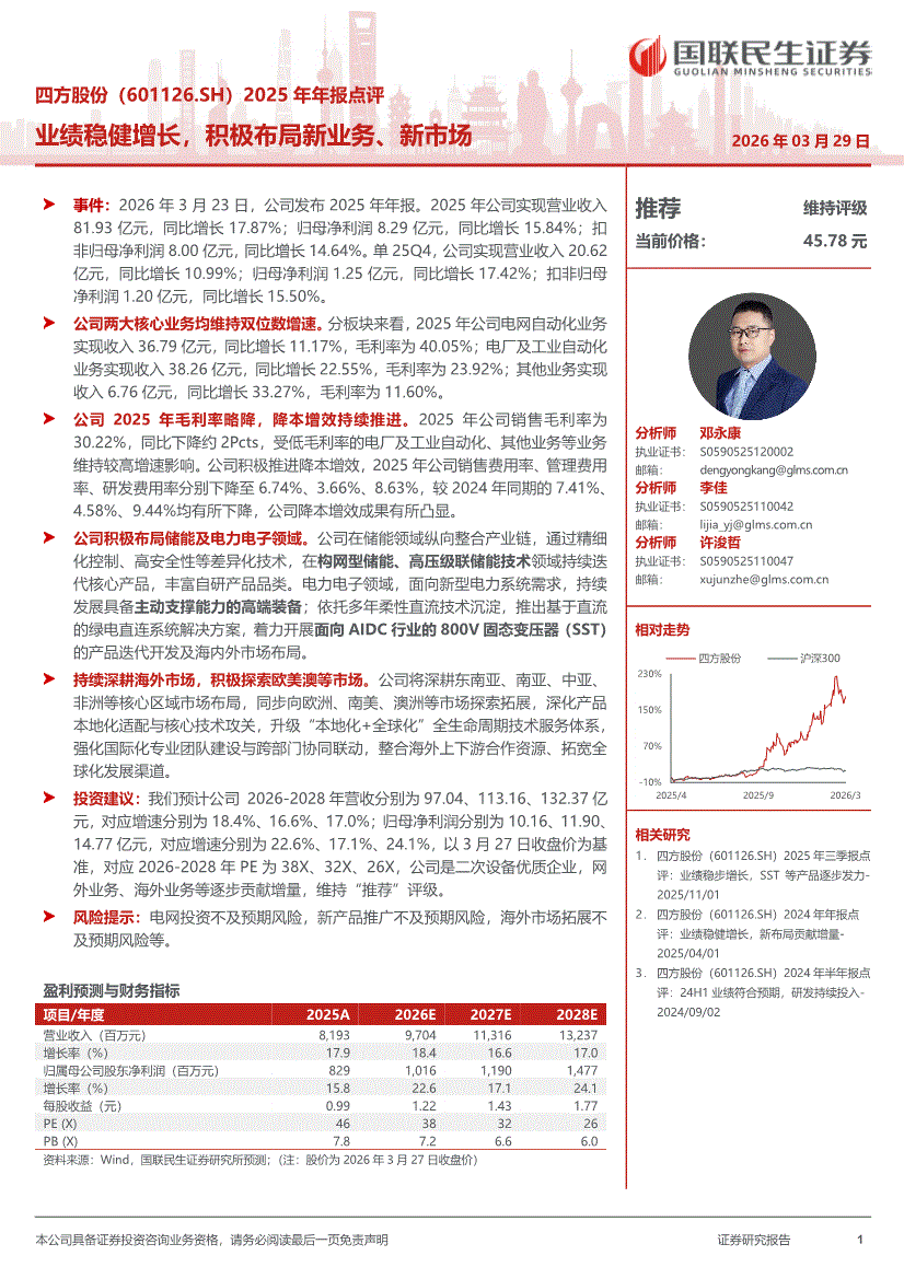 四方股份:国联民生证券-四方股份-601126-2025年年报点评:业绩稳健增长,积极布局新业务、新市场-260329